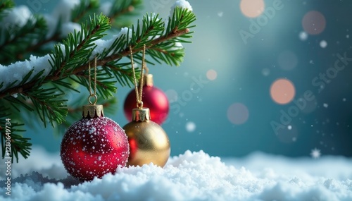 Branch of fir with multicolored snowballs and ornaments hanging from it, fir branch, snow globe