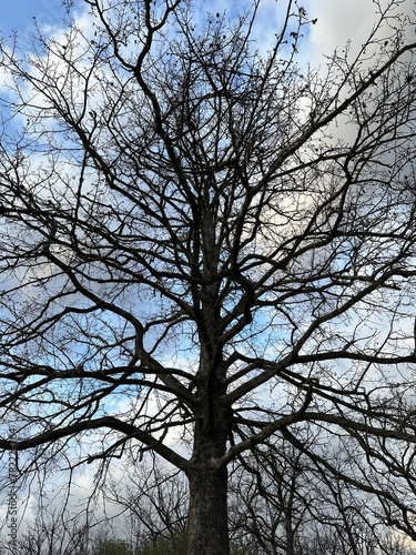 Branches of an old tree, close-up. Big tree with branches on the background of the sky. Background texture - branches of a huge tree.