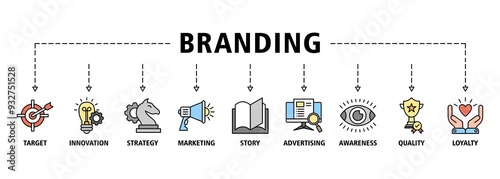 Branding banner web icon set vector illustration concept with icon of target, innovation, strategy, marketing, story, advertising, awareness, quality and loyalty icons symbol background live stroke