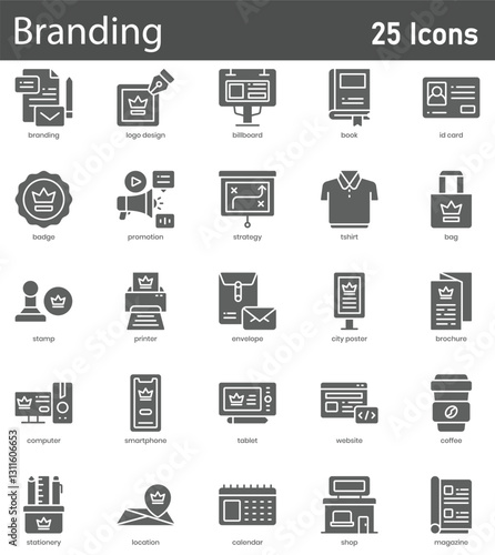 Branding includes outline vector icons illustrating company image, visual identity, promotional concepts, and business visuals. Editable stroke vector illustration.