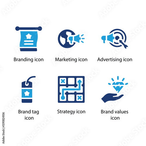 Branding, Marketing, Advertising, Brand tag, Strategy, Brand values, Blue Icon Set