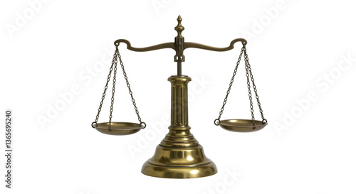 Brass balance scales symbolizing justice and fairness, representing law and order in a courtroom or legal setting, isolated on a white background