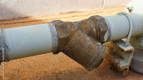 Brass Y-Strainer Closeup. The old Y-Strainer on the white pipe is a device for trapping debris or gravel in the water supply system. select focus