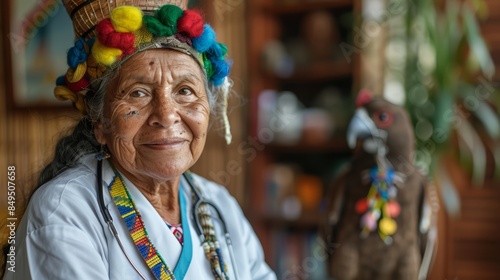 Brazilian doctor in a vibrant, bustling city clinic, wearing traditional attire and using both contemporary medical equipment and ancient Amazonian healing techniques