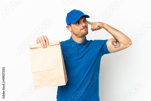 Brazilian taking a bag of takeaway food isolated on white background having doubts and thinking