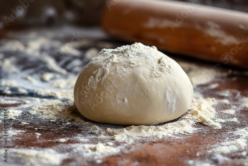 Bread dough sprinkled with flour on a wooden board in a rustic style