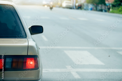 Break light of back side car stop on the road by traffic jam or running trip to travel in Thailand.
