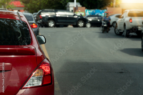 Break of red cars on asphalt roads during rush hours for travel or business work.