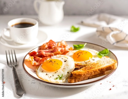 Breakfast plate with eggs, bacon, and toast (1)
