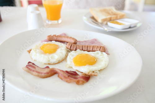 Breakfast with bacon , fried egg and orange juice