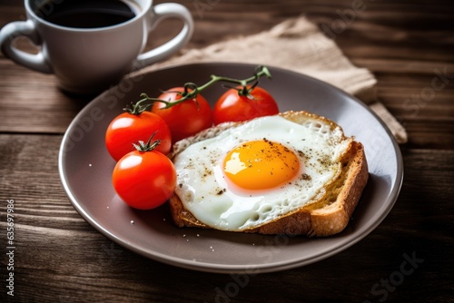 Breakfast with delicious fried eggs garnished with sliced tomato Generative AI.