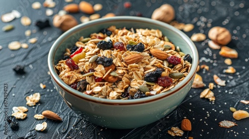 Breakfast yogurt bowl with granola, blueberries and maple syrup, gray background, top view, copy space. Healthy food concept.
