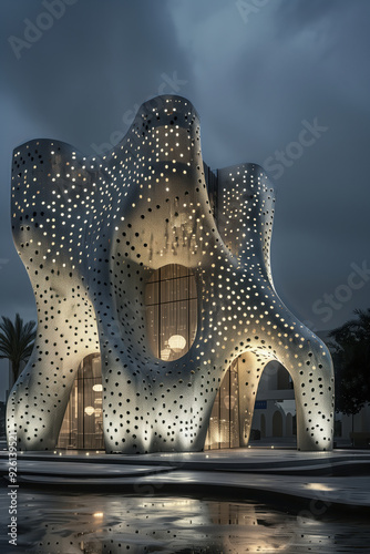 Breathtaking 3D Printed Building Facade with Unique Layered Design and Illuminated Patterns at Sunset