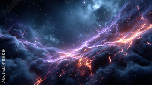 Breathtaking cosmic scene showing glowing purple and orange nebula clouds with sparkling stars scattered across deep space background, evoking wonder and mystery