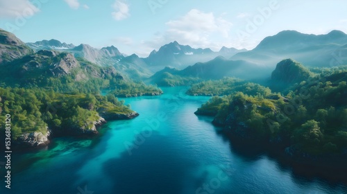Breathtaking drone view of jagged Norwegian coastline showcasing crystal clear waters and lush greenery