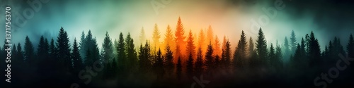 Breathtaking panoramic view of a serene forest landscape bathed in the warm ethereal glow of a vibrant sunset with mist and fog adding a captivating atmospheric