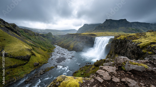 Breathtaking panoramic view of powerful waterfall flowing through rocky valley cloudy sky with lush green moss covering