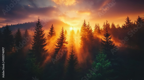 Breathtaking sunset over dense forest, with rays of light piercing through misty trees, creating serene and magical atmosphere