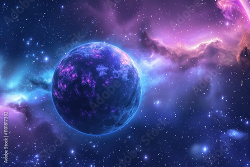 Breathtaking view of a distant, mysterious exoplanet with a vibrant atmosphere and a starry backdrop.