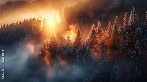 breathtaking view of snow covered pine trees illuminated by soft morning light, creating serene and magical atmosphere in forest. warm glow contrasts beautifully with cool tones of snow