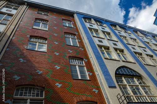 brick and blue and white façade of the house. Hackesche Hoefe is a notable courtyard complex located adjacent to Hackescher Markt in the center of Berlin.