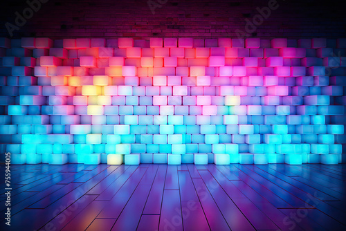 Brick wall with bright neon lighting. Generated by artificial intelligence