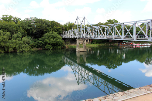 Bridge connecting Okayama Korakuen Garden and its reflection
