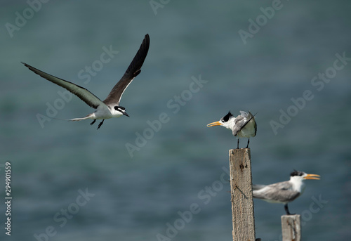 Bridled tern approaching greater crested tern at Busaiteen coast, Bahrain