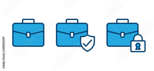 Briefcase icons set. Briefcase with shield and check mark, padlock symbol. Business protection, insurance, secure, safety. Vector illustration
