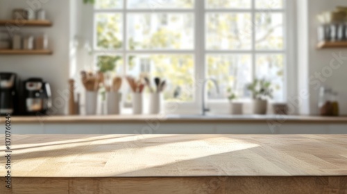 Bright and airy kitchen with wooden countertop and sunlight streaming through large windows during daytime