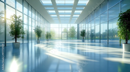 Bright and airy modern interior with large windows, reflecting light and greenery, creating a serene atmosphere.
