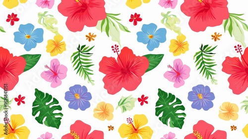 Bright and cheerful flat design vector seamless pattern with tropical Hawaiian flowers and foliage, creating a lively island-inspired floral background.