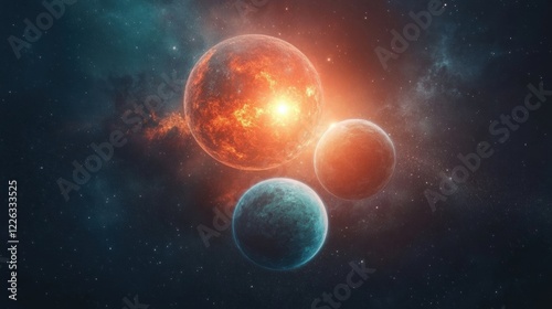 Bright and fiery planets orbit each other, showcasing intense colors and vivid details against the backdrop of outer space