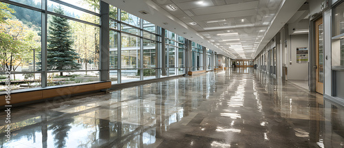 bright and spacious corridor in modern pharmaceutical research facility, featuring large windows and polished floors that reflect natural light, creating inviting atmosphere