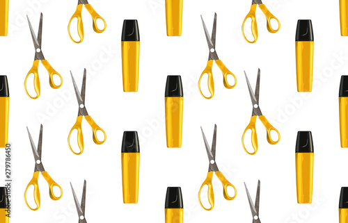Bright back to school seamless pattern with highlighters and pairs of scissors.