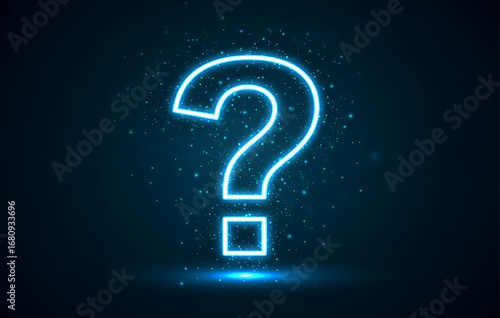 Bright blue neon question mark glowing against a dark textured background