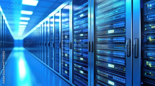 Bright blue server hallway with glowing racks and sleek reflections, ideal for visualizing modern data centers, cloud services, network systems, and IT infrastructure platforms