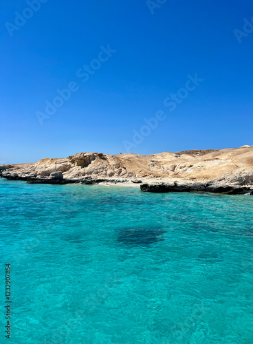Bright blue skies surround the serene turquoise waters, gently lapping against rocky cliffs in Egypt. The clear sea reflects sunlight, creating a stunning coastal view.