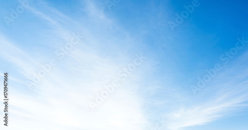 Bright blue sky filled with soft white wispy clouds stretching across, forming a serene and calming natural background that conveys openness, clarity, and peace.