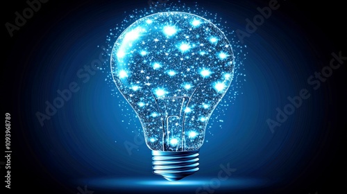 Bright Blue Sparkling Light Bulb with a Magical Glow Emitting Starry Particles on a Dark Background, Symbolizing Innovation and Creativity in Design and Ideas