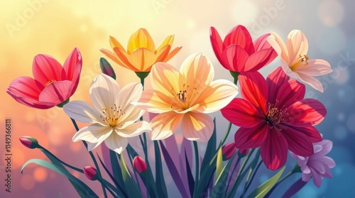 Bright bouquet of multicolored flowers with a vibrant bokeh backdrop