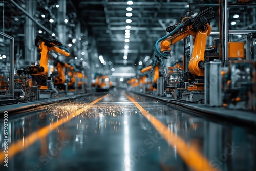 Bright car factory with robotic arms welding metal parts in precision sequence