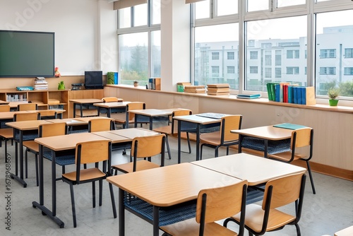 Bright Classroom with Blackboard and Student Desks
