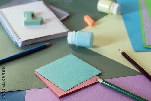 Bright colored paper, letters, stationery on the table, top view, background for inscriptions, back to school, education