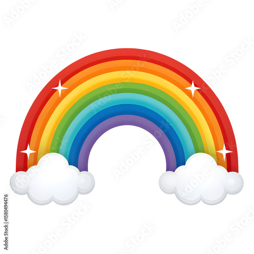 Bright colorful rainbow with fluffy clouds and sparkling stars isolated on transparent background