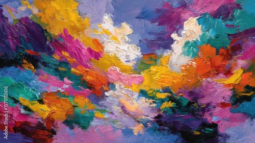Bright colors blend harmoniously in this vibrant abstract artwork, featuring swirling shapes and textured brushstrokes that evoke a sense of movement and joy.