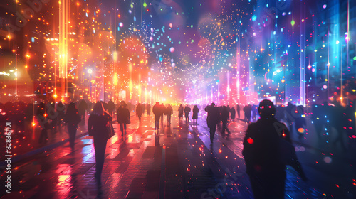 Bright colors illuminate the futuristic scene of an LGBTQ parade, with holographic fireworks and digital light shows creating a mesmerizing display in a digital illustration