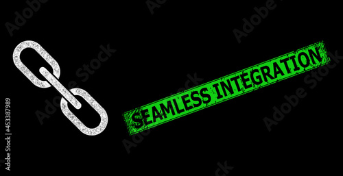 Bright crossing mesh chain framework with bright dots, and green rectangle scratched Seamless Integration seal imitation. Illuminated vector framework created from chain icon and crossing white lines.