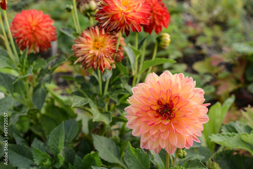 Bright dahlia flower. Large orange, yellow flower growing in the garden close-up.