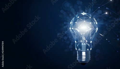 Bright Electric Light Bulb with Polygonal Connections on Dark Blue Background for AI Technology and Innovation